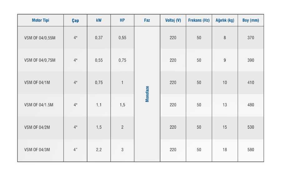 Üstün Vansan teknolojisi ile üretilen VSM Yağ Soğutmalı 4 inç Dalgıç Motor, 7,5 kw’a kadar sarılabilen dalgıç motorlardır. Gürültüsüz çalışan, yağ ile yağlamalı, periyodik bakım gerektirmeyen, dayanıklı ve uzun ömürlü motorlardır. VSM Dalgıç Motor kuyu eğiminden etkilenmeden çalışabilir. Dikey ve yatay çalışmaya uygundur. Paslanmaz gövde ve paslanmaz mile sahiptir. Flanş ve mil ucu Nema standartlarında olup, uygun tüm dalgıç pompalarla sorunsuz çalışır. VSM of 4” motorlarda monofaze ve trifaze modeller mevcuttur. Monofaze’de 0,5 – 3 HP (0,37 -2,2 kW), trifaze’de 0,75 – 10 HP (1 – 7,5 kW) aralıklarındaki modeller mevcuttur.