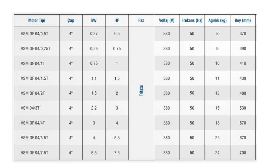 | Çap | kW | HP | Eksenel Yük (N) | Faz | Voltaj (V) | Frekans (Hz) | Boy (mm) |